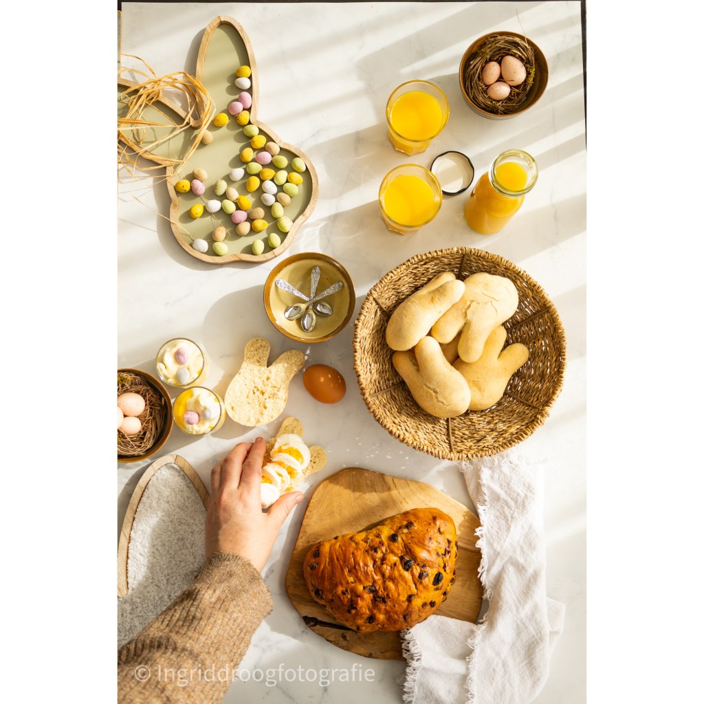Vroeger had ik altijd van die standaard gele kuikentjes in de wilgentakken, de kerst stol werd een paasstol, nu heb je leuke bordjes in allerlei vormen en kleuren, grappige broodjes in een paashaas vorm en lekkere toetjes als ontbijt!!